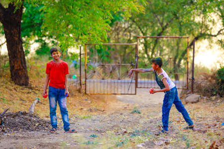 Indian little child throwing color and playing holi colors festival