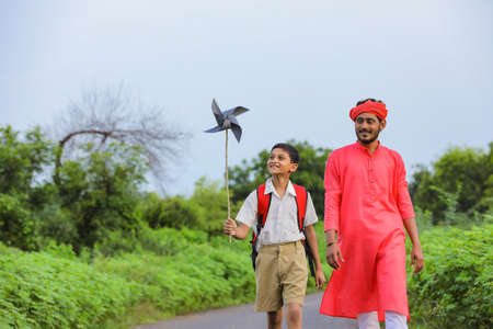 Indian farmer and his child playing with pinwheel on road side after school
