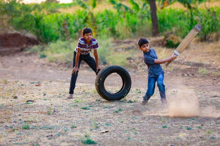 DISTRICT KATNI, INDIA - JANUARY 01, 2020: Asian poor village boys playing cricket game at countryside rural environment.