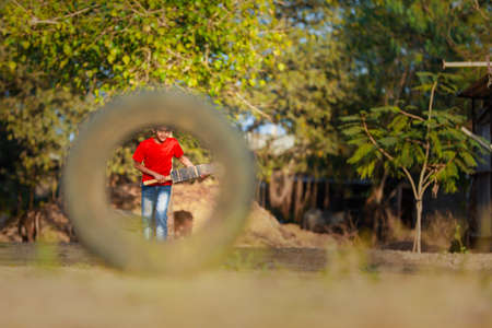 Farmer working on a tractor in the field. Selective focus.