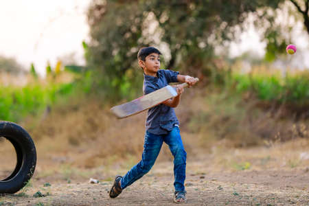 Rural Indian Child Playing Cricket.