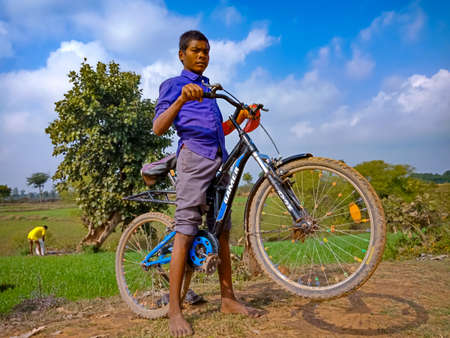 DISTRICT KATNI, INDIA - JANUARY 01, 2020: Asian poor village boy riding bicycle at countryside rural environment.