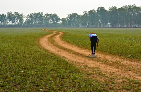Young man running in the green fields in the morning. Fitness and lifestyle concept.