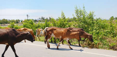 Group of cow are walking on the road with blue sky and cloud in countryside at Thailand. Rural as a background.