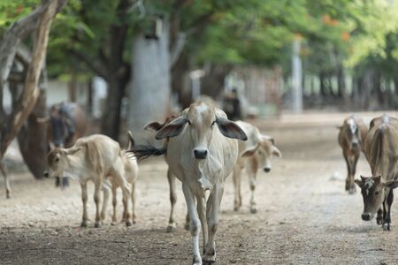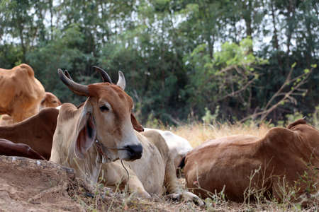 Herd of long eared cattle in a field on hot day in Thailand