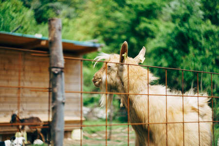 Close-up portrait of brown goat in profile, behind the fence on the goat farm.