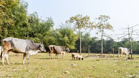 Cattle grazing in field. A typical dairy farm land in rural Bengal, North East India depicting simple rural life. An Village View of Rural India. Bethuadahari, Nadia, West Bengal, India.