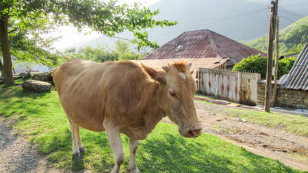 The cow eats the grass going through the village.