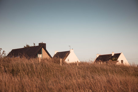 Typical Breton houses rooftops seen from a nearby meadow with long grass. Brittany, France.