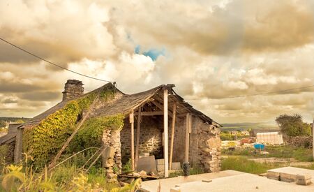 Panoramic top view of an old small abandoned ruined village on the hills with thatched roof huts at sunset with clouds in the sky and green meadows