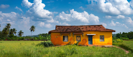 Green grass and a beautiful cloudy blue sky surround this traditional Indian village house.
