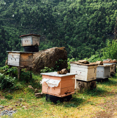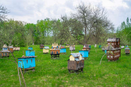 Decorative wooden beehives at apiary. Bee hive in village green garden.