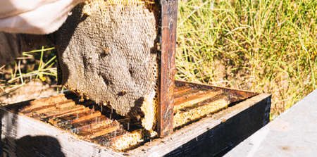 Beekeeper is working with bees and beehives on apiary. Bees on honeycomb. Frames of bee hive. Beekeeping. Honey. Healthy food. Natural products.