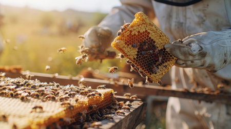 A beekeeper gently tends to bee hives in a lush environment, his gloves covered in pollen and propolis. His dedication to the craft shines through the image