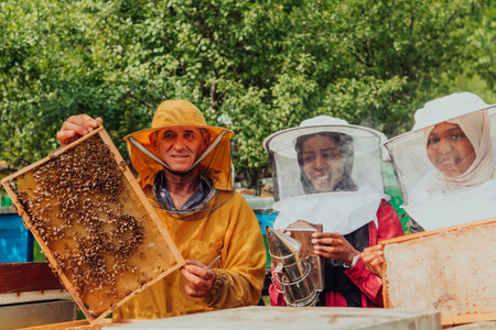 Arab investors checking the quality of honey on a large bee farm in which they have invested their money. The concept of investing in small businesses