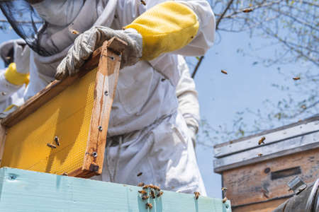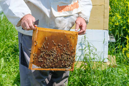 A beekeeper in protective clothing holds a frame with honeycombs, examines bees in the apiary. Preparing for the harvest of honey.