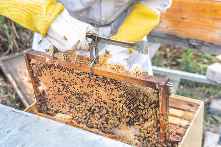 Beekeeper is working with bees on honeycomb frame. Beekeeping concept.