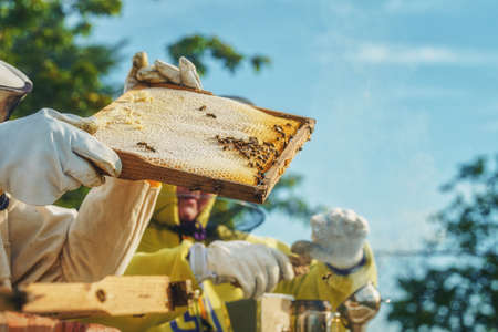 Beekeepers checking honey on the beehive frame in the field. Small business owners on apiary. Natural healthy food produceris working with bees and beehives on the apiary.