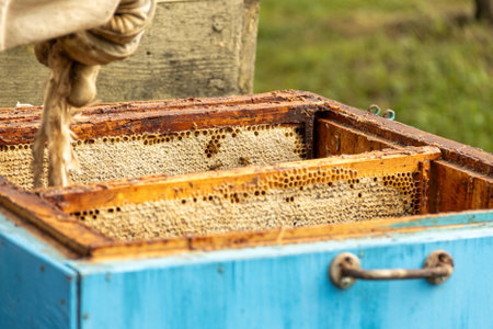 Beekeepers check the honey on the hive frame in the field. Beekeepers check honey quality and honey parasites. A beekeeper works with bees and beehives in an apiary.