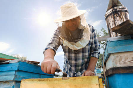 Beekeeper taking frame from hive at apiary. Harvesting honey