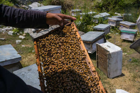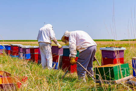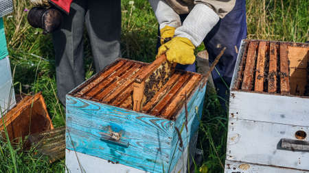 Beekeepers are taking out the honeycomb on wooden frame to extract honey from bee hives, harvest.