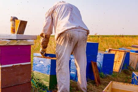 Beekeeper is working with bees and beehives on the apiary.