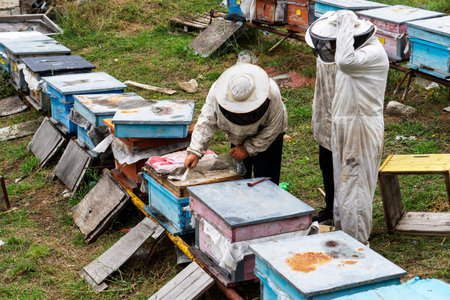 Beekeepers inspecting a hive on a farm, promoting pollination and the health of the agricultural ecosystem