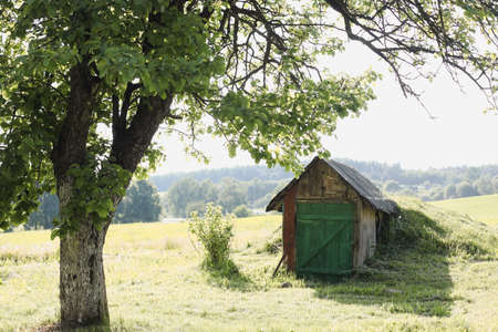 Small wooden house in rural field, view on a farmhouse in countryside, summer scenic landscape.