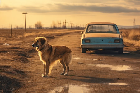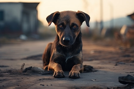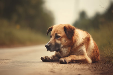 Dog road summer. Serious and fluffy adult brown animal lying pavement. Generate AI