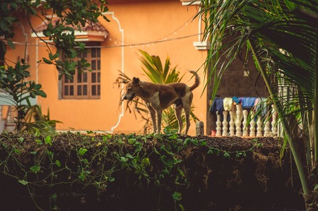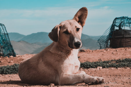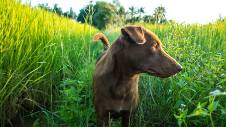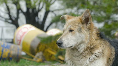 Beautiful dog on nature with sad eyes. Domestic animals in the nursery. Stock photo