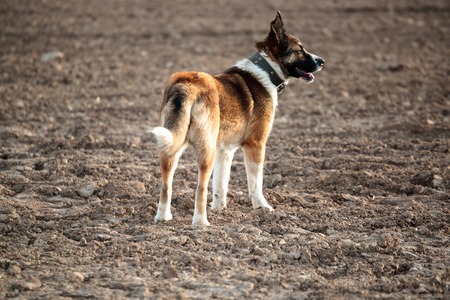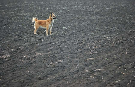 A farm dog sitting beside a newly planted potato field, watching the horizon.