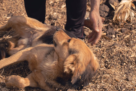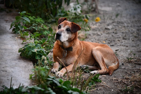 ginger dog lies. the dog lies on earth. dog friend of man. the dog is playing. a pet. Dear friend. four paws.