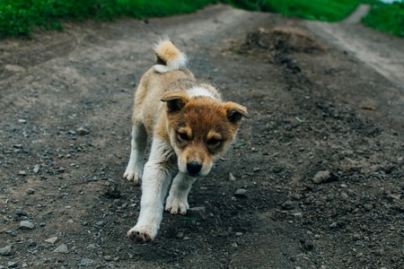 Adorable puppy on the roadside . Young dog lie on the side of the road in russia