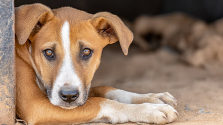 A street dog sitting on the wet ground during rain. Ai-generated.