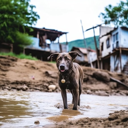A homeless stray street dog stands in dirty water. Sad and lonely dog. Flooded city concept. Accident at a hydroelectric power station.