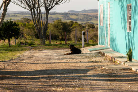 Black large shaggy mestizo dog lies in the yard in summer. Portrait of a purebred dog outdoors in nature