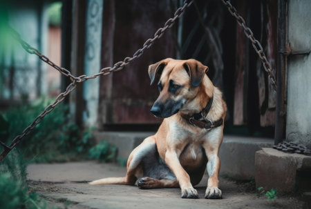 Abused dog alone abandoned on street. Homeless starving animal in chains captivity. Generate ai