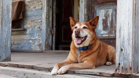 Happy dog lounging on wooden porch beside weathered building enjoying peaceful day with cheerful expression and sunlight illuminating its fur