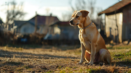 A beautiful golden dog sits patiently in a sunlit outdoor environment, showcasing its playful personality against a rustic background of houses and grass.