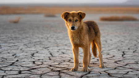 Dog standing alone in a parched wasteland. Water crisis and water shortage in summer during long drought is a global problem of drought on the planet