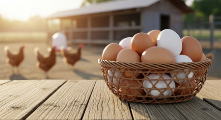 Fresh brown and white eggs in a woven basket on a rustic wooden table. chickens and a coop are blurred in the sunny farm background, symbolizing organic food and farm life.