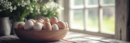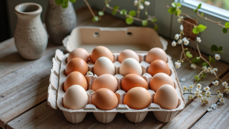 Fresh brown eggs in rustic kitchen setting with spring blossoms. That the image is generated using AI.