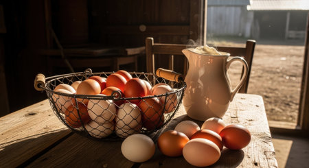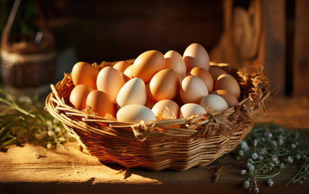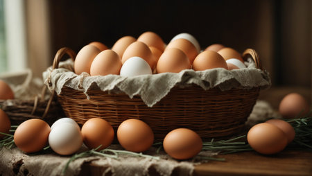 An AI generated illustration of a basket filled with fresh, farm-collected eggs on a soft-lit table