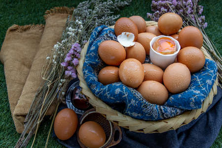 Organic brown eggs in bamboo basket