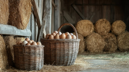 A charming rustic farm scene featuring woven baskets filled with fresh eggs, surrounded by straw and hay bales in a cozy wooden barn setting.