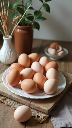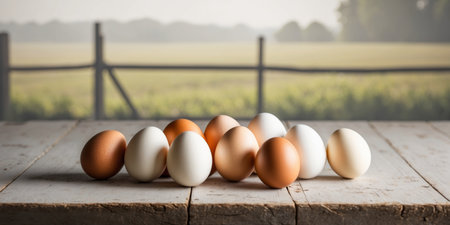 raw organic farm eggs arranged artistically, with ample copy space for branding or messaging, in a realistic photograph