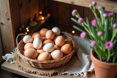 Basket of brown and white eggs on rustic shelf with flower pot and cozy lighting. That the image is generated using AI.