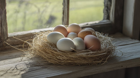 A serene scene featuring a nest filled with an assortment of colorful eggs resting on a rustic wooden window sill. Sunlight softly illuminates the eggs, creating a peaceful atmosphere inspired by nature.