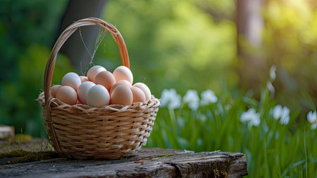 Basket of eggs in a sunny garden with flowers, grass, and natural elements.