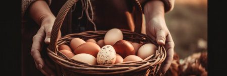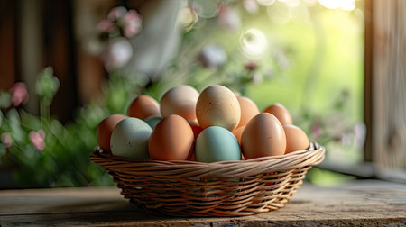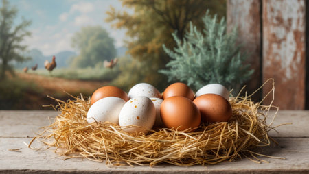 Fresh eggs in a straw-lined basket on a farm table. free copy space
